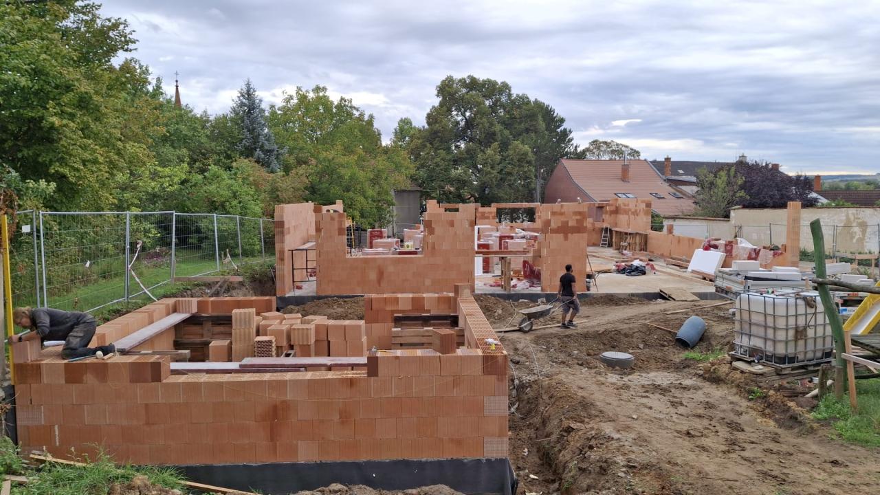 Buduje se hrubá stavba objektu Dětské skupiny ve Chvalkovicích na Hané. Do konce měsíce září by mělo být dokončeno vyzdění s věncem.